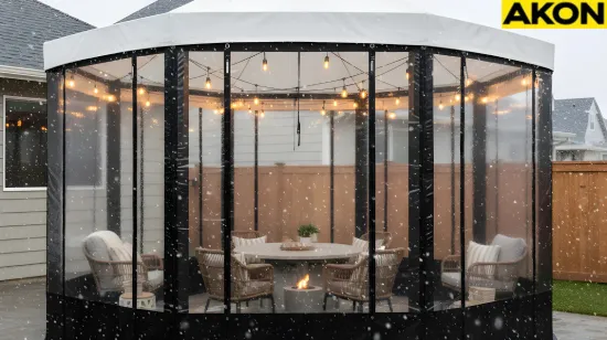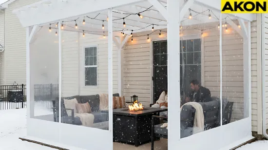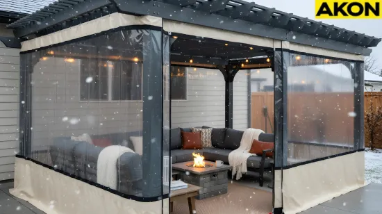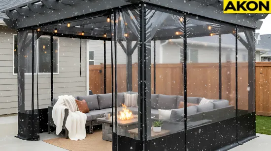 Akon designs these panels for simple installation and seasonal removal, giving homeowners an easy way to keep their pergola warm and welcoming throughout the year.