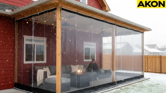 Clear vinyl panels keep out wind and snow while allowing full sunlight and outdoor views for a bright, open feel.