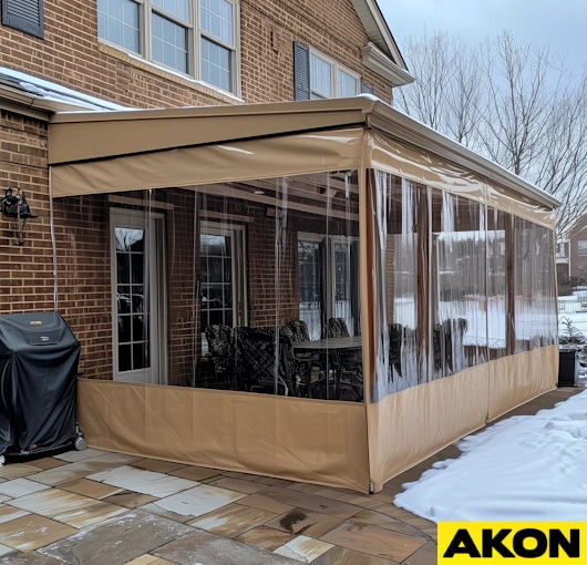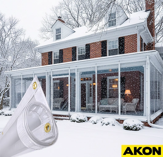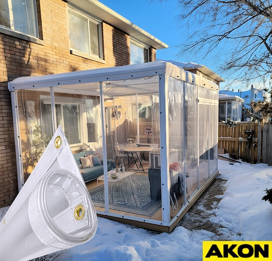 You can find clear film online that costs about $40 and lasts about 40 minutes in harsh conditions. AKON does not supply film material, as our specialty is working with industrial and commercial customers. As such, we use thick 20 and 30 mil clear PVC that can endure the rigors of winter, wind, and UV light. Our material is also made to size, which means you don't have extra material flapping around in the wind. This not only looks unsightly but also does a poor job of keeping out the weather.