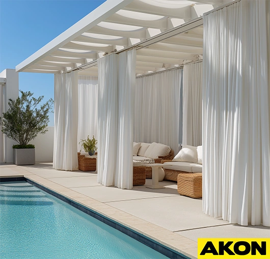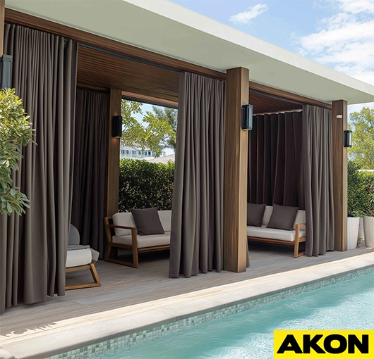 Our custom outdoor curtains accommodate a wide range of requirements. The curtain is made from 600 Denier breathable knitted fabric that provides 85% shade and is highly resistant to abrasions and fractures. It is optimal for preserving an inviting and airy ambiance while also offering exceptional UV protection. The material is made of 100% solution-dyed polyester, which guarantees durable weather protection.