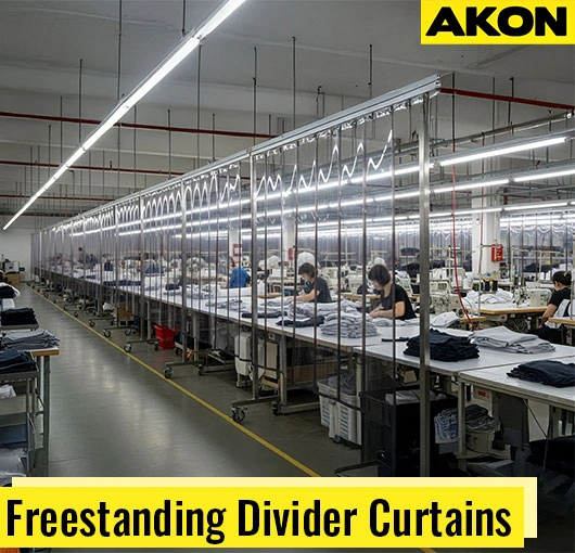 Freestanding vinyl dividers are portable partitions mounted on metal frames. They allow quick setup and repositioning, ideal for temporary zones, seasonal use, or evolving production layouts.