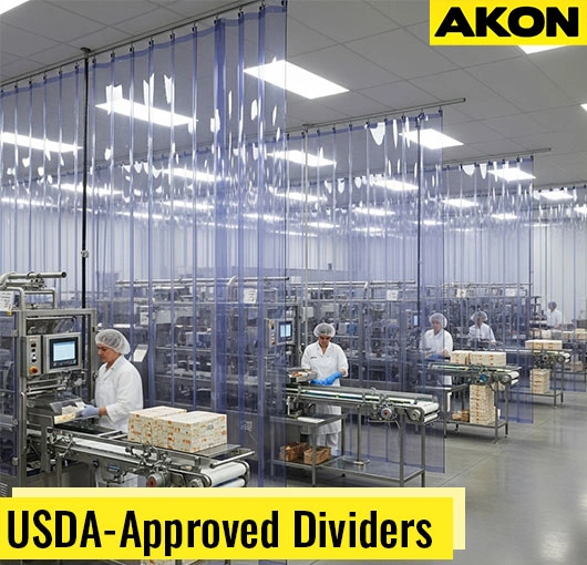 Food processing operations face requirements that standard dividers can't meet. AKON's USDA-approved Washdown Curtains are specifically designed to handle the demands of food safety regulations.