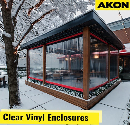 AKON's Tarps with Clear Windows are built tough for restaurants and commercial spaces. These aren't your typical tarps. They're designed to take a beating from snow, wind, and whatever else winter throws at them. The clear window sections let natural light in and give your diners something to look at, so it doesn't feel like they're sitting in a cave.