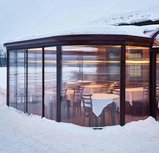 A vinyl enclosure uses clear or insulated PVC panels mounted to the patio perimeter with tracks, grommets, or zippers. It blocks wind, rain, and drifting snow while maintaining service flow and visibility. Panels can roll up or be removed seasonally, creating a flexible, weather-ready dining space.