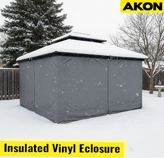 This makes them ideal if you're planning to use your gazebo as a workshop or studio space during the colder months. While the insulation does reduce your view of the snow outside compared to clear vinyl, AKON allows you to customize your enclosure and add vision panels that let light in and give you views of the outdoors. You get the benefit of a warm, comfortable space that's actually usable in winter, which makes the slightly reduced visibility a worthwhile exchange.